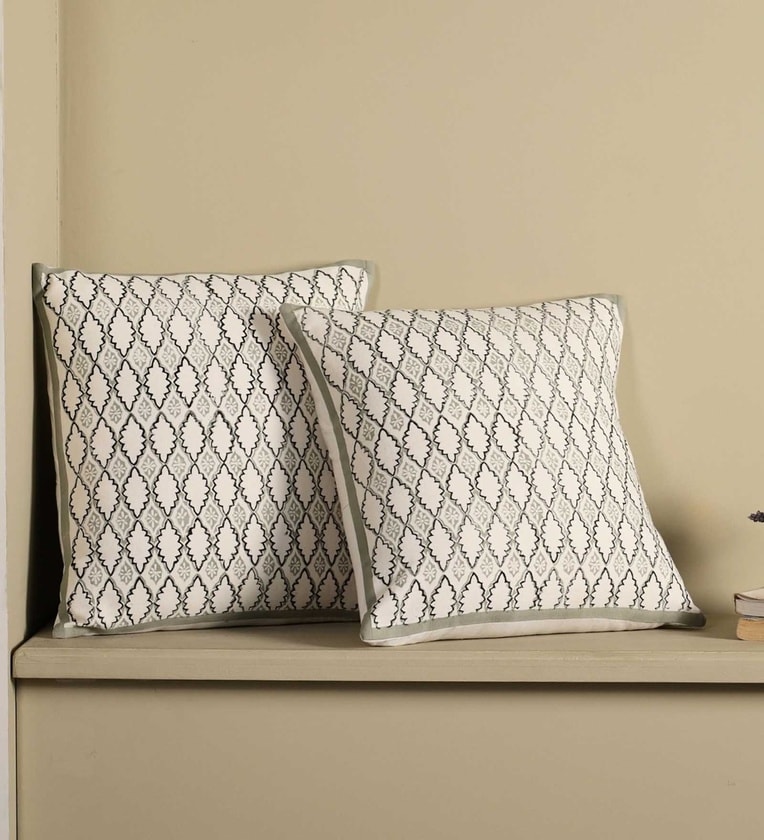 Refresh your d cor with this set of 5 handblock printed cotton cushion covers in aqua green and off white. Featuring bold geometric patterns, each 18x18-inch cover adds style and comfort. Ethically crafted, they make a thoughtful festive or housewarming gift for loved ones.