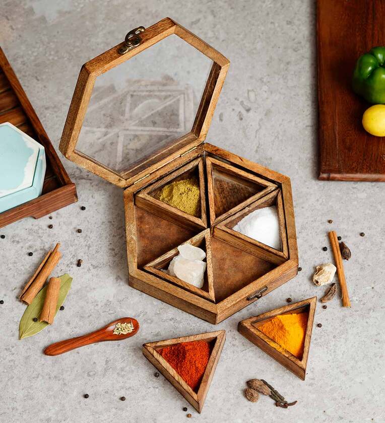 One 6 Triangle Compartments Handcrafted Wooden Spice Box