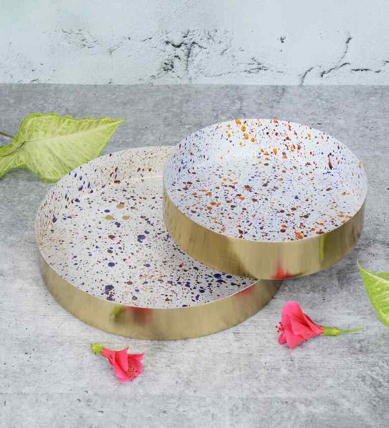 A)Serving Tray- L 10.14; W 10.14; H 1.37" , B)Serving Tray- L 8; W 8; H 1.56"