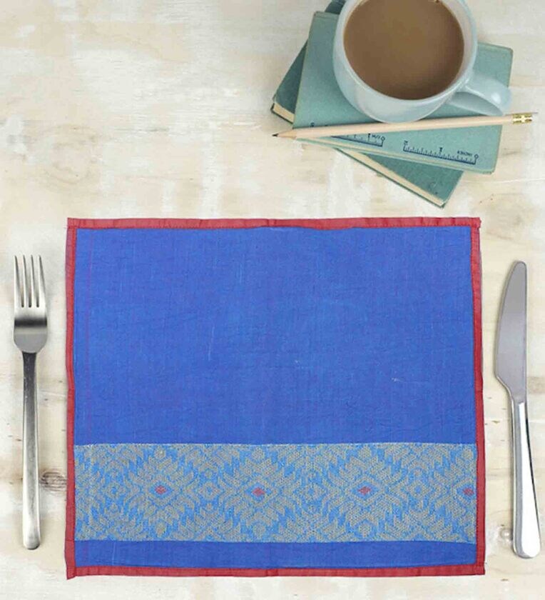 Handloom Woven with Assamese Motif Blue Cotton 12 X 18 Inches Placemats (Set of 4)