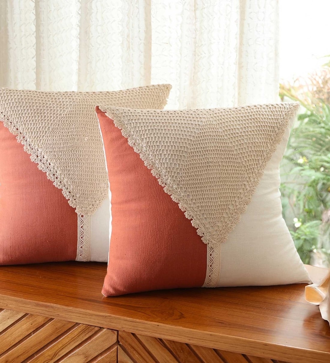 Add artisanal detail to your space with this set of 2 handmade rust and off-white cotton cushion covers. Sized 16x16 inches, the delicate crochet work offers timeless elegance. Perfect for sofas, chairs, or beds, and a wonderful choice for gifting.