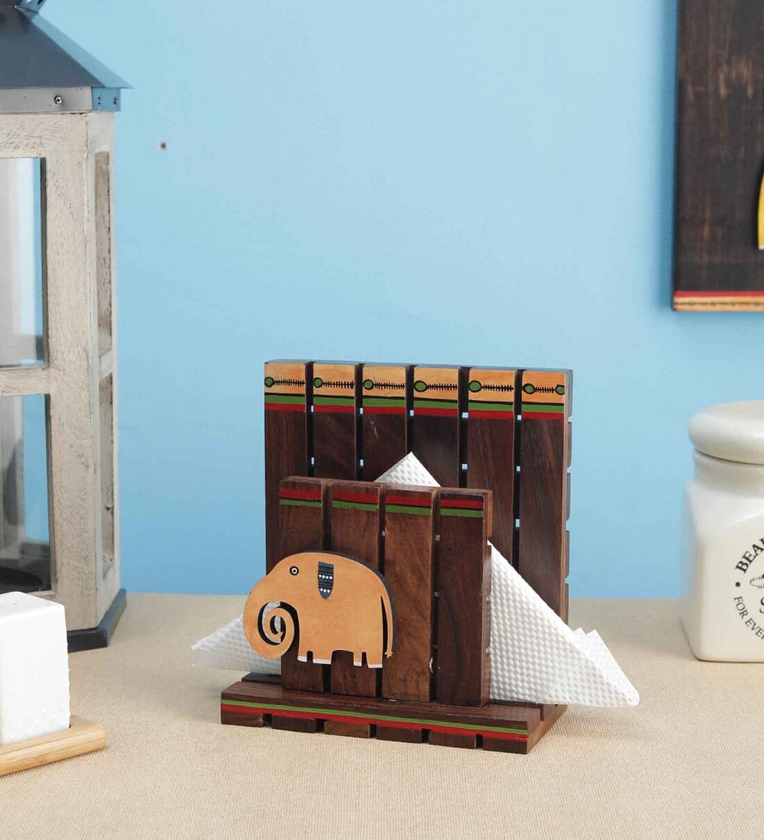 Hand crafted in wood, the Tusks & Trunks series from VarEesha, is perfect to add to the ethnic look of your decor. Inspired by Gondian art, it has beautifully painted multicolored elephants that are symbolic of grace and intellectual strength. The colour of wood is contrasted with choicest earthen tones of oranges, blues, yellows and greens to bring a touch of rustic elegance to your home. Compact and stylish, these wooden accessories are perfect for your dining table for everyday meals or special dinners with friends and family. The range contains a number of options for dining and decor like napkin holders, cutlery holders, organizers, key holders etc and make a matching theme at your home. These ethnic pieces also make excellent gifts for your loved ones. Each piece is hand carved uniquely and thus may differ slightly from the image in shade or pattern adding to its authentic natural look. Orange Elephant Sheesham Wood Panels Napkin Holder is a part of this range and measures 6x4x4.75 inches in lxbxh.