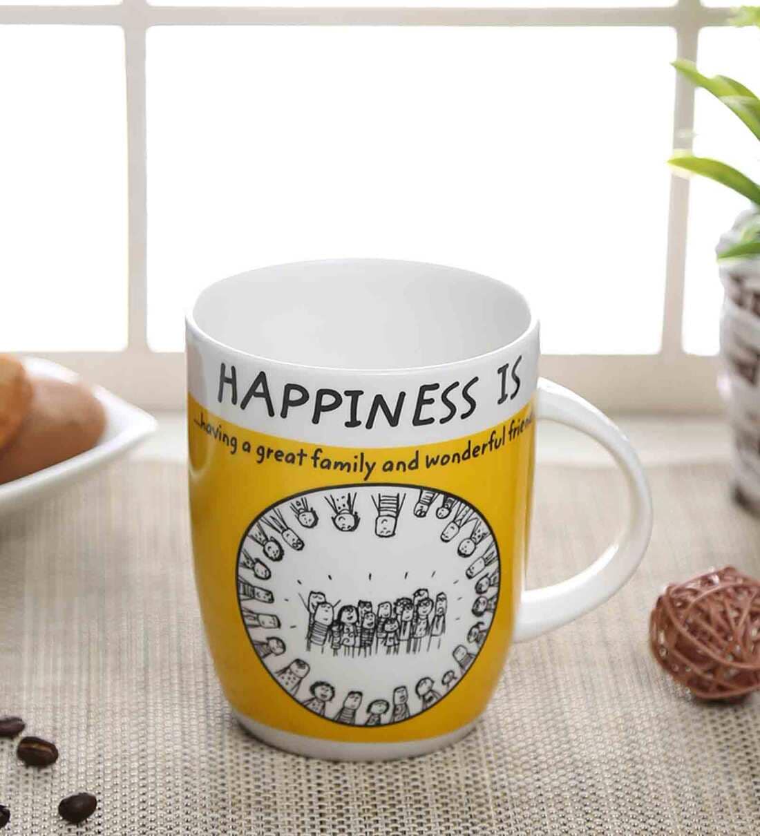 Happiness Quotes 300ml Yellow & White Ceramic (Set of 2) Coffee Mug