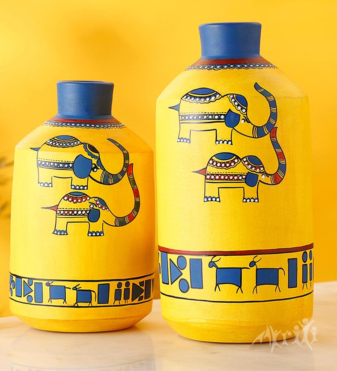 Happy Elephant Madhubani (Set Of 2) Yellow Terracotta Table Vase