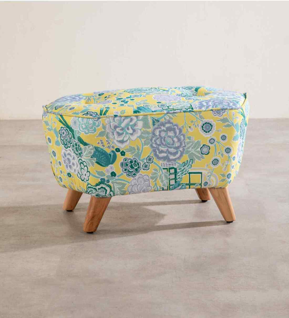 Hexa Acacia Wood Pouffe in Yellow Fabric