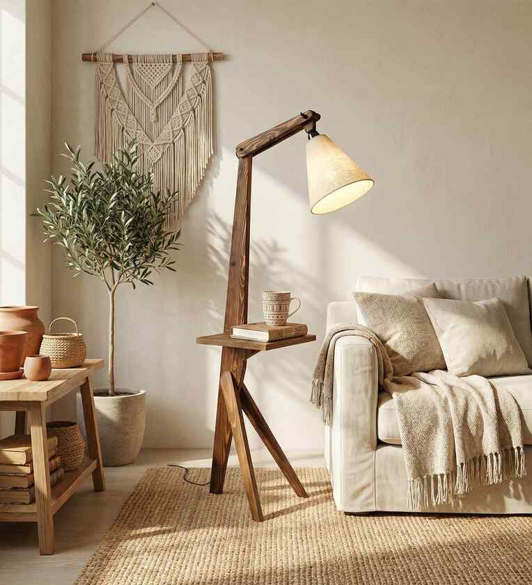 Hubert Wooden Shelf Floor Lamp with Wooden Shade & Brown Base