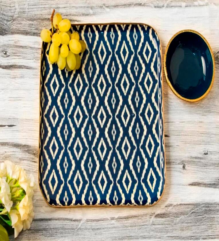 This Square shaped aluminium platter has a glossy enamel core with a mesmerising Ikkat print that adds elegance to your table setting. It wears a coat of lacquer that meets international food safety standards. Paired with an aluminium dip bowl with, its ideal for serving snacks or passing nibbles at a party.Care: avoid from deep water soaks and hard cleaning chemical.