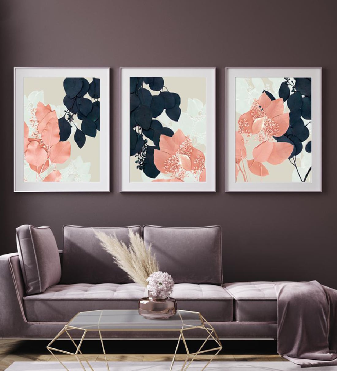 Framed wall art set titled: Indigo and Blush Leaves . A set of 3 artworks.