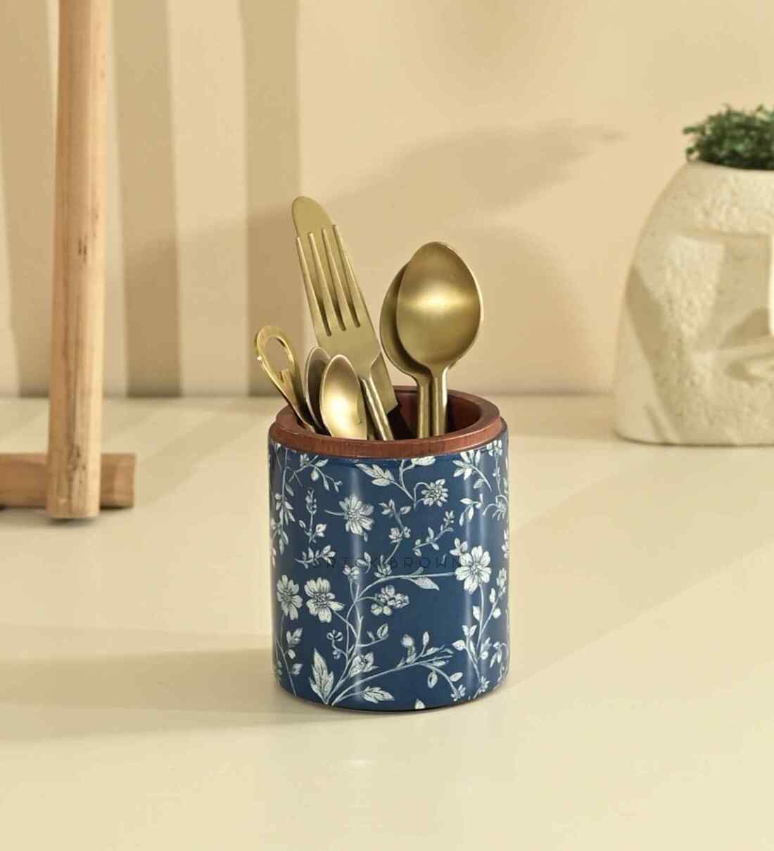 ?? Still hiding your beautiful table under plastic or clutter? Add vintage elegance with the Indigo Cutlery Holder�a practical piece with artistic flair. ?? Handcrafted from solid mango wood, it features a deep indigo base wrapped in delicate white vines for a soft, heritage-inspired aesthetic. ? Store ? Organize ? Display Use it for cutlery, brushes, pens, or kitchen tools�its compact form fits seamlessly in any space. ?? Mahogany-finished rim and interior offer earthy contrast, while the glossy enamel coating adds a refined finish and wipe-clean ease. ?? From stylish dining setups to creative corners, this handcrafted piece is a statement of beauty and function�ideal for gifting too. ? From India to the world � experience artisanal luxury, globally delivered