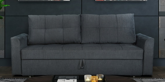 Ines Chenille Fabric Pull Out Sofa Cum Bed In Charcoal Grey Colour with Storage