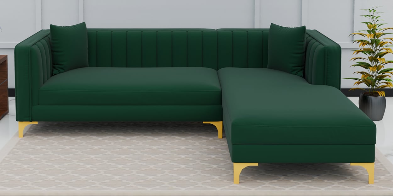 Foam: Duroflex foam 32 D & 28 D Leg Material: Metal legs Internal dimensions: 3 Seater h: 76cm w: 182cm d:78 cm Lounger : h 76 cm : W 76 cm : D: 152 cm Seat Suspension - Elastic Belt-70mm Webbing & Zig zag springFabric Material -Velvet FabricGround Clearance - 5 InchesSeating Height - 17 InchesKey Features - High Quality Solid Wood Structure, Premium Quality High Resilience Branded Foam, Strong Legs, Heavy Weight Bearing CapacityFrame Material - solid sal Wood / 12 Mm PlyWeight bearing capacity - 350kg