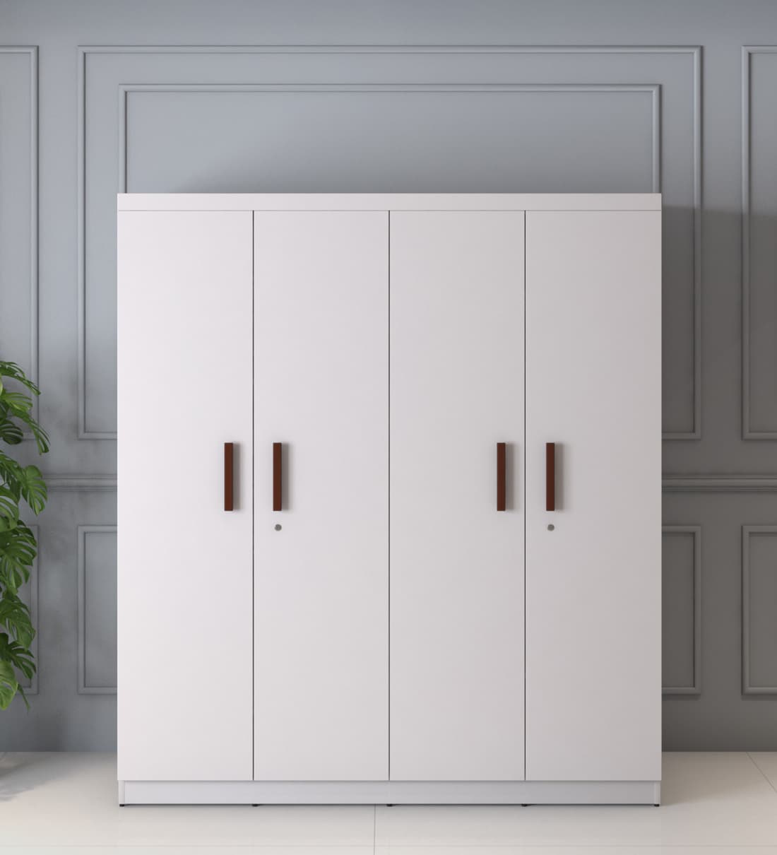 4-door design with 2 hanger rods, 7 shelves, 1 lockable drawer, and a safety locker offers abundant storage.