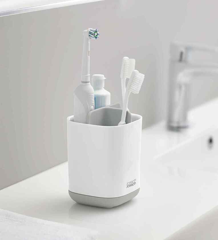 This neat toothbrush caddy is divided into three sections providing organised storage for a variety of oral care items such as manual/electric toothbrushes and toothpaste tubes. It dismantles for easy cleaning and features a ventilation hole for quick drying and a non-slip base.