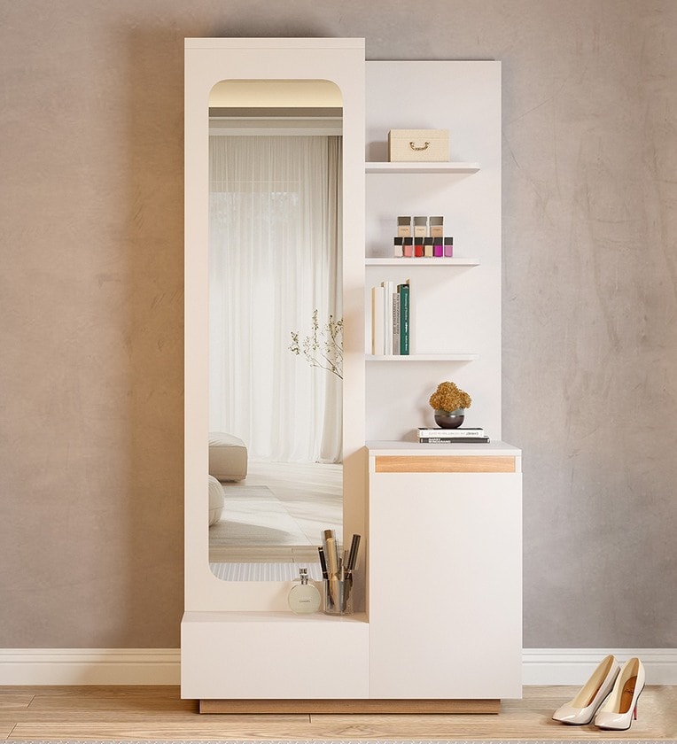 • Masterfully crafted of pre-laminated engineered wood in frosty white and teak brown finish. • Sleek full-length mirror adds functionality without compromising on aesthetics. • Tiered open shelves keep your beauty essentials within reach. • 1 handleless drawer and 2 cabinets provide abundant closed storage. • Plinth base anchors the design with a grounded, modern appeal. • Smooth finished edges eliminate moisture seepage, prevent warping, and make it last longer. • Buffers ensure smooth, easy mobility while protecting floors from scratches • This product is a part of the Juda Collection.