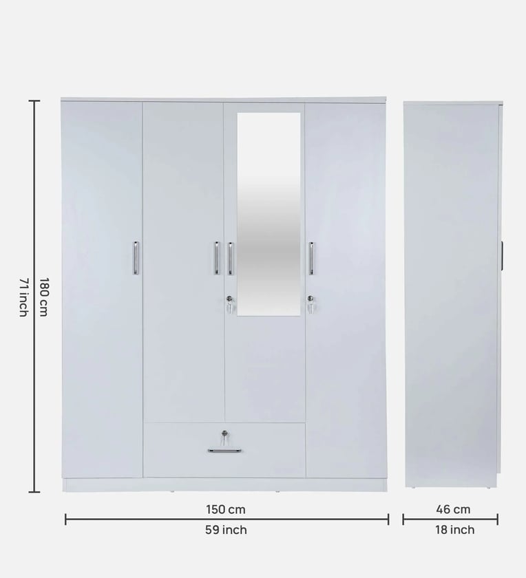 Kenzou 4 Door Wardrobe With Adjustable Shelves In Off White Finish With Mirror & Drawer