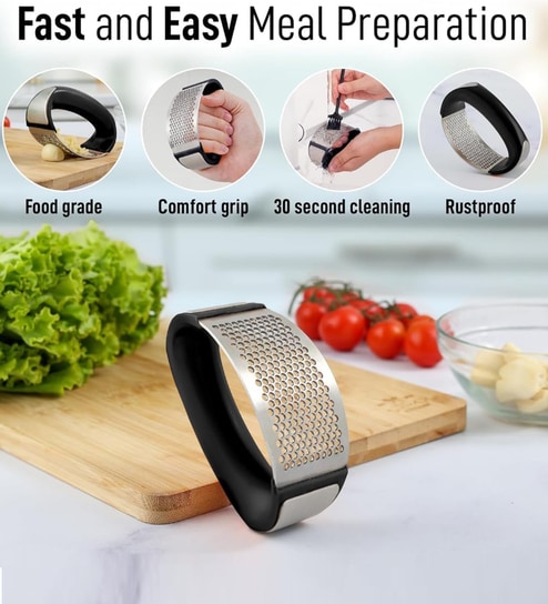 slight back and forth rocking motion to crush or mince garlic easier, easily crush or mince garlic, ginger and onion in half the time and strength. New innovation ergonomic design with arc shape, comfortable to hold and easy to make a squeeze, even ideal for those with weaker grip force or small hands. stainless steel totally rust-proof, with special craftsmanship the garlic press is extra solid and durable, no worry about deformation at all. Garlic is collected on the surface of the rocking garlic press , no extra dishes to clean. Smooth metal surface just need a quick flush. Compat size, portable and easy to store. Use rocker to press garlic cloves, gingers, pilled nut, fresh fruit pieces etc. Perfect gift for yourself and family.