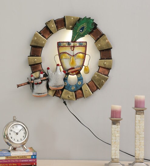 Iron Lord Krishna Wall Art With LED In Brown