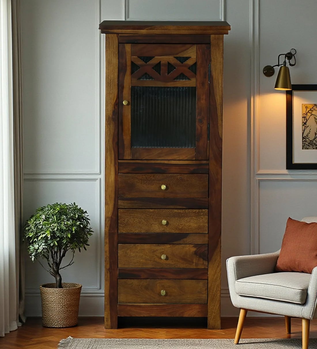 Kryss N Sheesham Wood Tall Cabinet In Scratch Resistant Provincial Teak Finish