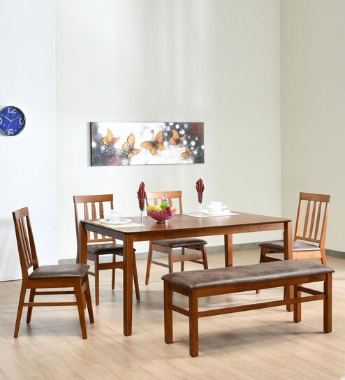 Leaf Solid Wood 6 Seater Dining Set with Bench in Walnut Finish