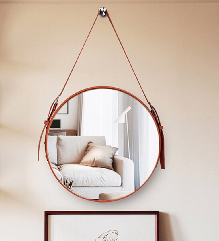 Genuine Leather Cladding: The mirror is fully enveloped in genuine tan leather, offering a modern, sophisticated aesthetic while ensuring durability.