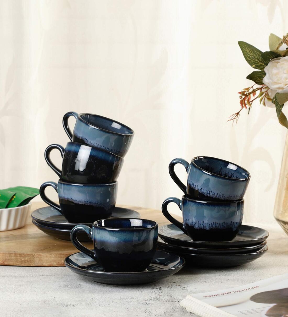 Some say, the ocean stirs the heart, inspires the imagination and brings eternal joy to the soul. The ocean is known to put things into perspective for many. The endless, deep blue makes one feel very small in comparison to the nature, makes one feel humble; part of a much bigger picture. Life is like Ocean Waves; it goes up and down. The waves keep coming back to the shore no matter how many times they are sent back. This beautiful thought about the tireless effort of deep blue ocean waves is what inspires VarEesha's ceramic collection - Leher. This elegant range has dinnerware, serve ware and decor accessories in beautiful blue-black shades. Please keep in mind that each piece is hand painted and the shade might come out different for each piece. They are baked at extremely high temperatures making it difficult to predict the final outcome, thus adding to the natural authenticity of the pieces. Not only are these very convenient to handle, they are microwave and dishwasher safe. Made of premium lead-free ceramic, each of them would add elegance to your dining experience. These are also very good options for gifting, be it any special occasion. A lovely part of this beautiful ceramic collection is Inky Blue Ceramic Cups & Saucers Set. This set has six cups measuring 2.5x3 Inches in dia x h that have a capacity of 130 ml each. Matching saucers complete the look.