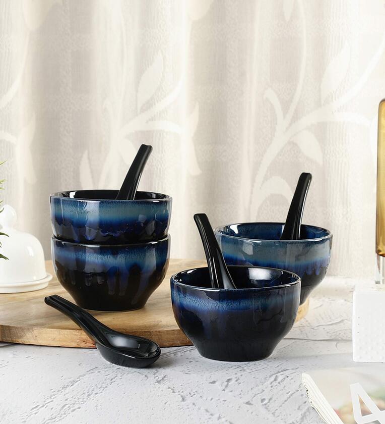 Some say, the ocean stirs the heart, inspires the imagination and brings eternal joy to the soul. The ocean is known to put things into perspective for many. The endless, deep blue makes one feel very small in comparison to the nature, makes one feel humble; part of a much bigger picture. Life is like Ocean Waves; it goes up and down. The waves keep coming back to the shore no matter how many times they are sent back. This beautiful thought about the tireless effort of deep blue ocean waves is what inspires VarEesha's ceramic collection - Leher. This elegant range has dinnerware, serve ware and decor accessories in beautiful blue-black shades. Please keep in mind that each piece is hand painted and the shade might come out different for each piece. They are baked at extremely high temperatures making it difficult to predict the final outcome, thus adding to the natural authenticity of the pieces. Not only are these very convenient to handle, they are microwave and dishwasher safe. Made of premium lead-free ceramic, each of them would add elegance to your dining experience. These are also very good options for gifting, be it any special occasion. A lovely part of this beautiful ceramic collection is Inky Blue Ceramic Soup Bowls Set. This set has four pieces measuring 4.5x3 inches in dia x h and each can hold upto 275 ml. These bowls are just the right size to have cereal/ maggi or soup. They also come with matching spoons.