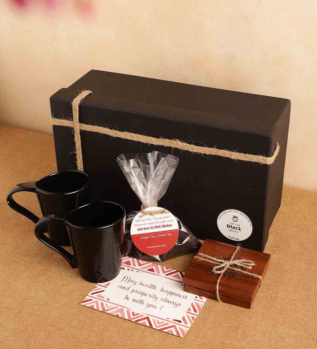 Love the giver more than the gift... But its a tough competition if the gift is more beautiful !! Gift- giving is one of the love languages across the world, for a reason. Gifts are ways to express how much you adore someone or appreciate them by sending them love and warmth through small little things. Showing forethought, effort and a flair is what makes the gift, a hit. From kids to grannies,everyone loves a beautifully packed box of goodies that brings a full-blown smile to their faces. To create this delightful moment and an experience to remember, VarEesha brings forth a range of individually curated gift boxes. Whether you are looking to surprise your loved ones on their special days, or want to create memorable experiences for your guests on your D-day, or say thank you to your employees, or just feel like just giving - we got your back! From the name, the unique handmade pieces and fresh confectionaries, the contents are well thought of and put together in an ethnic & lovely packaging. A thought or wish on a personalized message card makes the gifting experience all worth it. Bringing with them, positive vibes and warm fuzzy cheer, these boxes are not just to gift, they are to get. The Let's Go Black Gift Box is a box full of love that pays homage to the ever-stylish Black. It has two hand painted cups, two hand crafted coasters, a bag of tea leaves and a card wishing someone a boat load of happiness.