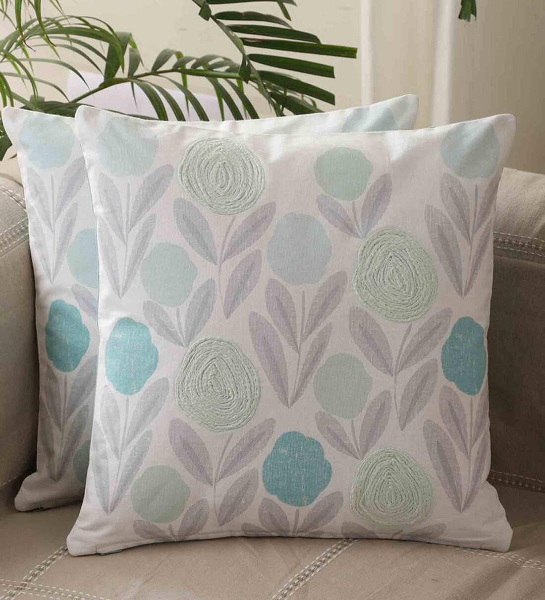 Light Green Floral Cotton 16 x 16 Inches Cushion Covers (Set of 2)