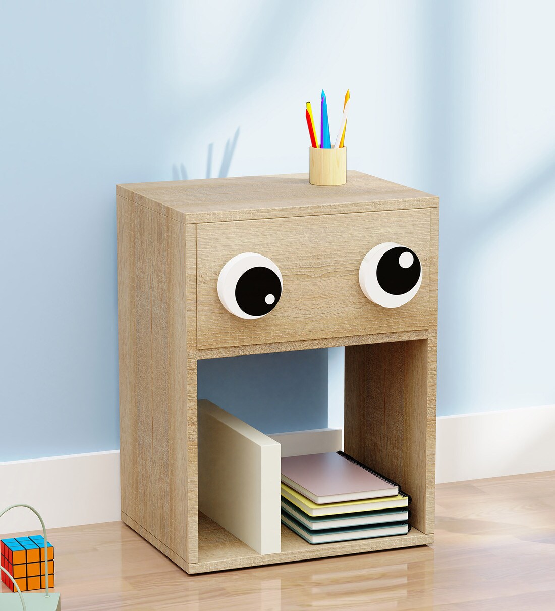 Drawer included for storing all Knick Knacks. Partition underneath to stack books and use as support. Free standing unit, designed for ease of kids. No sharp corners. No nasty bumps. Eco-friendly high grade laminate makes clean-up a breeze. Non-toxic paint used minimally. Boingg! Banishes bad fumes!
