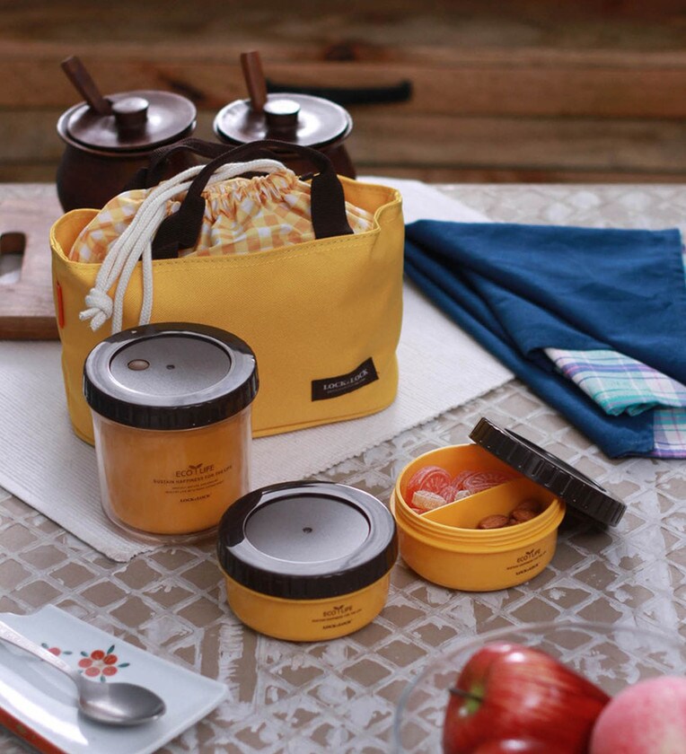 The Lock 'N Lock Bento Yellow Plastic Round Lunch Box Set with Big Bag - Set of 3 is the perfect answer to all your food storage needs. Made from plastic, this lunch box set is completely dishwasher, freezer, and microwave-safe. Perfect for packing your entire lunch, this yellow-coloured food storage container set comes with an easy-to-carry bag. A one stop-shop for home decor and furniture, Pepperfry sells a home product every 30 seconds.