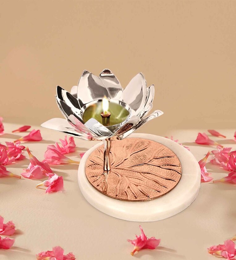 Lotus Diya With Marble Silver Aluminium Candle Stand