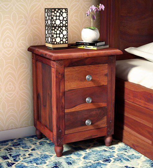 Louis Sheesham Wood Bedside Table In Honey Oak Finish With Drawers