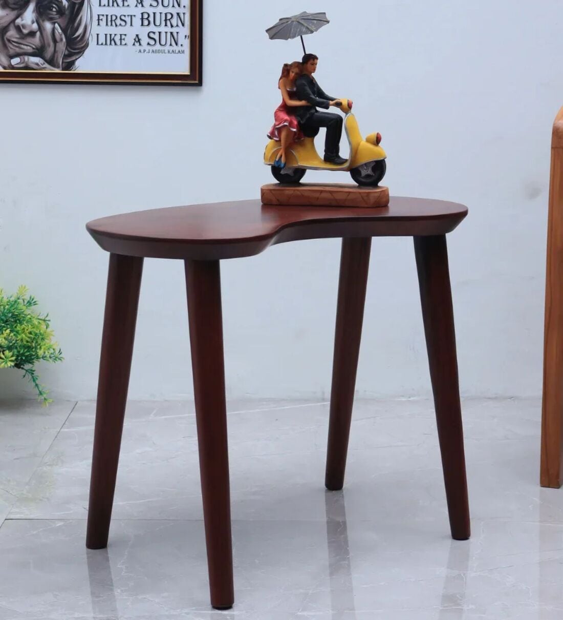 The Luna Teak Wood Coffee Table is a modern table with a special free-form top that gives a fresh look to your space. The curved shape of the top makes it look different and helps it fit well in corners or next to sofas. The flat surface is smooth and wide enough to keep cups or showpieces. This coffee table stands on four round tapered legs that give a classic touch to its style. The brown color top looks bold with the teak color legs. This table is a good choice for any living room as it gives both style and use. Its small size is good for tight spaces and the unique shape makes it stand out. The round edges are soft and safe so it is also good for homes with children. You can use it beside a sofa or by itself and it will add beauty to the room. The shape and finish together give the table charm from every side. The brown color and teak polish show the wood grain and make the table look warm and natural.