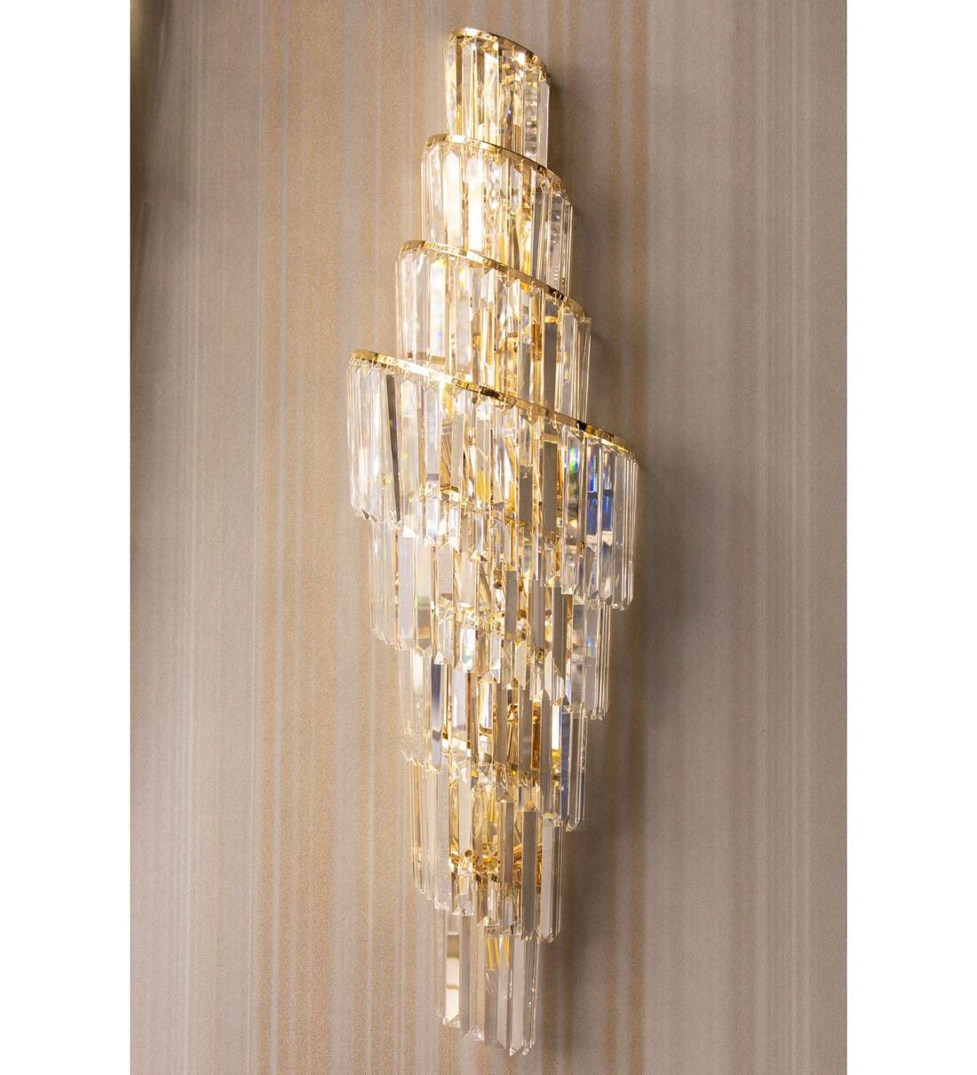 Create a stunning focal point with this luxurious cascading crystal wall light featuring sleek vertical crystal rods and a refined gold finish. The layered design reflects light beautifully, casting a warm and glamorous glow. Perfect for living rooms, staircases, bedrooms, or hotel-style interiors, it adds timeless elegance and premium appeal to any space.