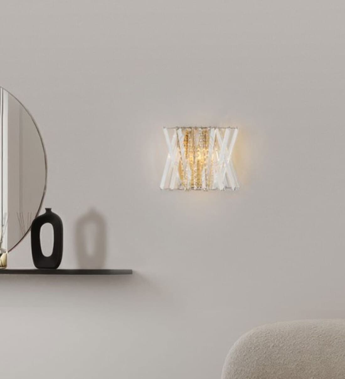 Add a touch of elegance to your walls with this luxury crystal wall light. Designed with a striking geometric frame in clear crystal and golden accents, it creates a sparkling glow that enhances any modern interior. Perfect for bedrooms, living rooms, hallways, or feature walls, this wall light combines contemporary style with timeless sophistication.