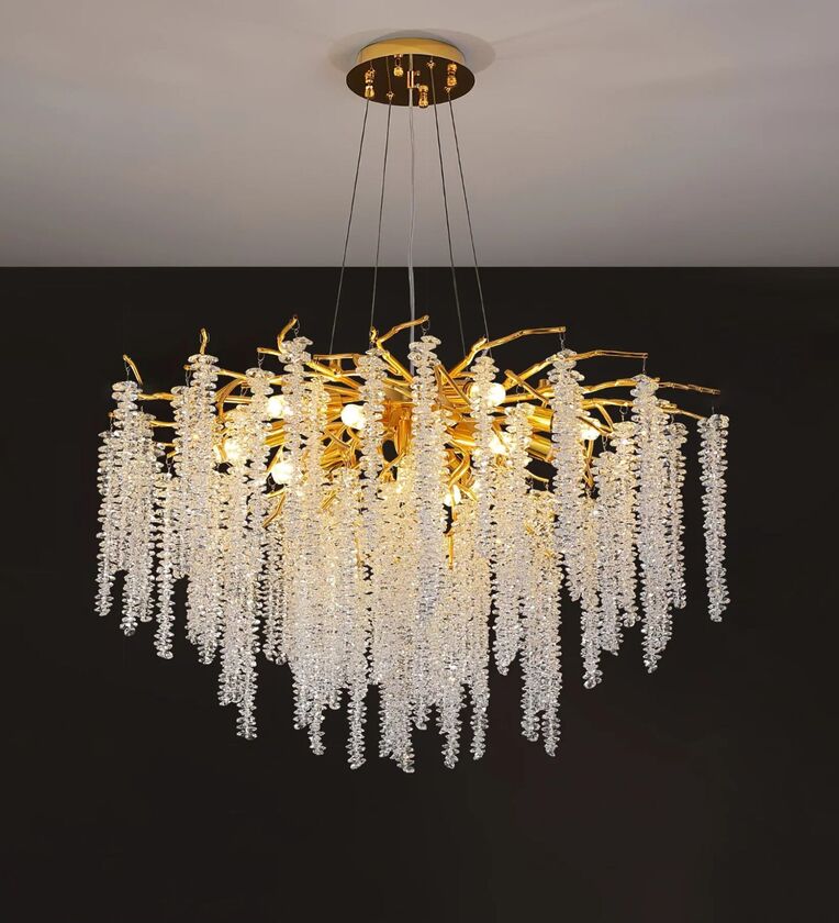 A breathtaking centerpiece featuring cascading crystal strands inspired by nature s elegance, paired with a golden branch-style frame. Perfect for living rooms, dining spaces, or grand entrances, this chandelier adds glamour and sophistication to any interior.