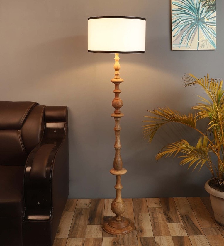 Madison White Metal and Fabric Shade Club Floor Lamp With Wood Base
