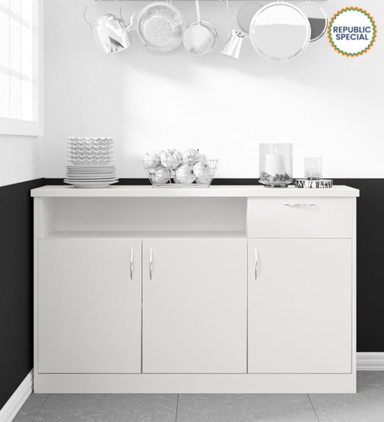 Woodbuzz, a leading furniture brand specializing in stylish, premium quality and affordable furniture. We aim to provide exceptional value to our customers in terms of superlative quality, an empathetic personal touch and an after sales relationship that goes beyond business.The Woodbuzz Crockery Cabinet range is comfortingly familiar, yet refreshingly new. A combination of one drawer and three spacious cabinets with racks provides plenty of room to stash away your fine crockeries, cutlery, napkins, and more. To display your tableware and glassware the upper open space which comes in handy to set up a buffet service go perfect. High on style and storage, it will offer a rich-look to every kitchen interior.