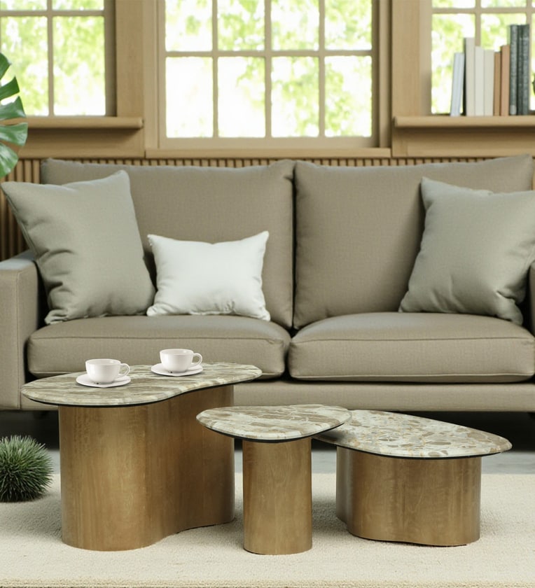 Manastir Coffee Table Set In Natural Finish With Panther Marble Top (Set of 3 )