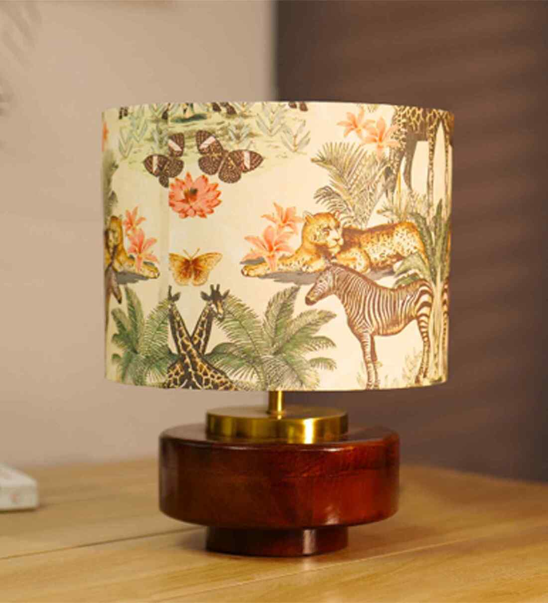 Mango Wood Turtle Base Table Lamp With Jungle Tales Fabric Lampshade 14"