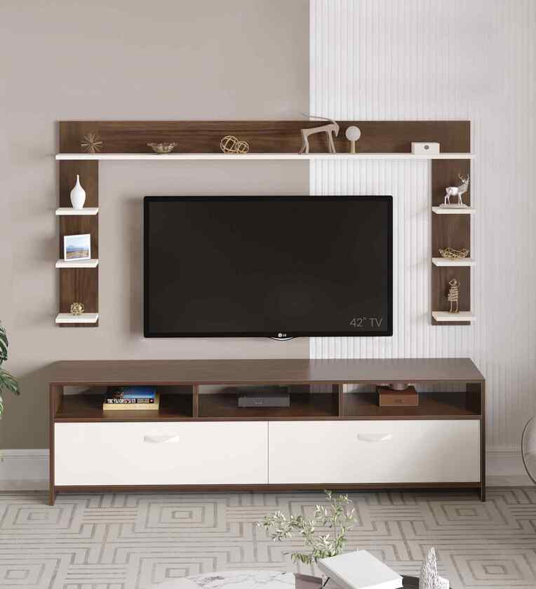 Product Dimensions: Length ( 160 Cm or 63 Inches) Breadth ( 30 Cm or 14.2 Inches) Height ( 126 Cm or 49.6 Inches) Made of Particle Board (High grade prelam engineering wood with natural wood grain finish) Color - Brown Maple & White, TV Size - Upto 65 Inches, Multi-Functional Storage, Elegant contemporary design with premium dual-tone finish Assembly Required - DIY (Do-It-Yourself) Installation, It means you'll have to install it yourself or arrange a carpenter to install it for you. It comes with the necessary hardware including a detailed installation guide. Warranty : 2 years warranty on manufacturing defects.
