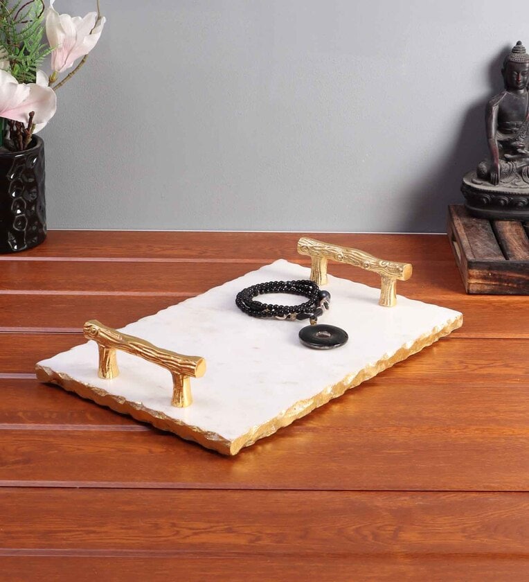 Package Contains: 1 Marble Serving Tray || Color : White and Golden || Material: Natural Marble & Metal Approxinimate Weight :3000 gram Dimensions of Tray: 14 inch L x 9 inch W x .5 inch H Premium Marble Construction: Crafted from high-quality marble, this serving tray is both durable and elegant, adding a sophisticated touch to any space. Gold Metal Handles: Features sleek, gold-finished handles for a luxurious look and easy handling, combining function and style seamlessly.