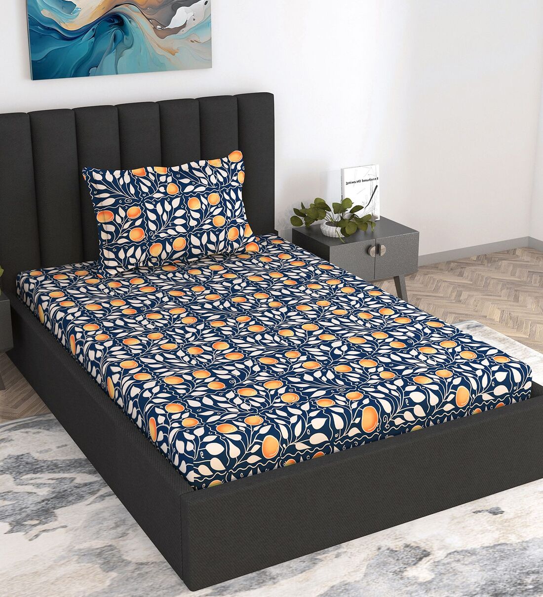 Marlin Floral 144 Tc Cotton Elastic Fitted Single Bedsheet With Pillowcover