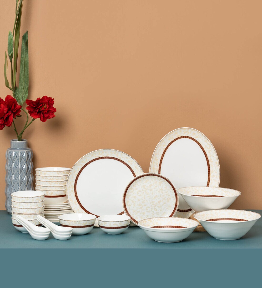 Box Contents- 6 Full Plate, 6 Quarter Plate, 1 Rice Plate, 6 Veg Bowl, 6 Soup Bowl, 2 Serving Bowl, 6 Spoon, 1 Nappy Bowl Full Plate Diameter - 27 cm Quarter Plate - 19 cm Rice Plate - 31 cm Veg Bowl - 10*10*2 cm Capacity - 185 ml Soup Bowl - 12*12*2 cm Capacity - 300 ml Serving Bowl - 18.5 cm Capacity - 1000 ml Nappy Bowl - 1300 ml Material- Fine Ceramic Microwave & Dishwasher Safe Always Wash after use and store in a dry place.