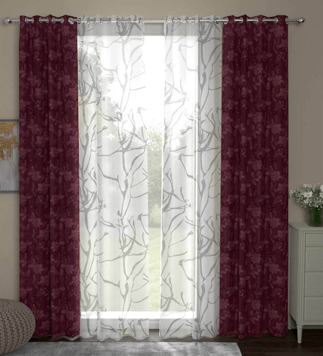 Maroon Semisheer Polyester 7 Feet Eyelet Set of 4 Curtains