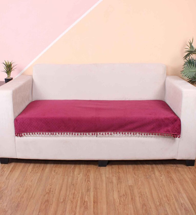 Maroon Solid Velvet 3 Seater Quilted Sofa Cover (Protector) with Pompom