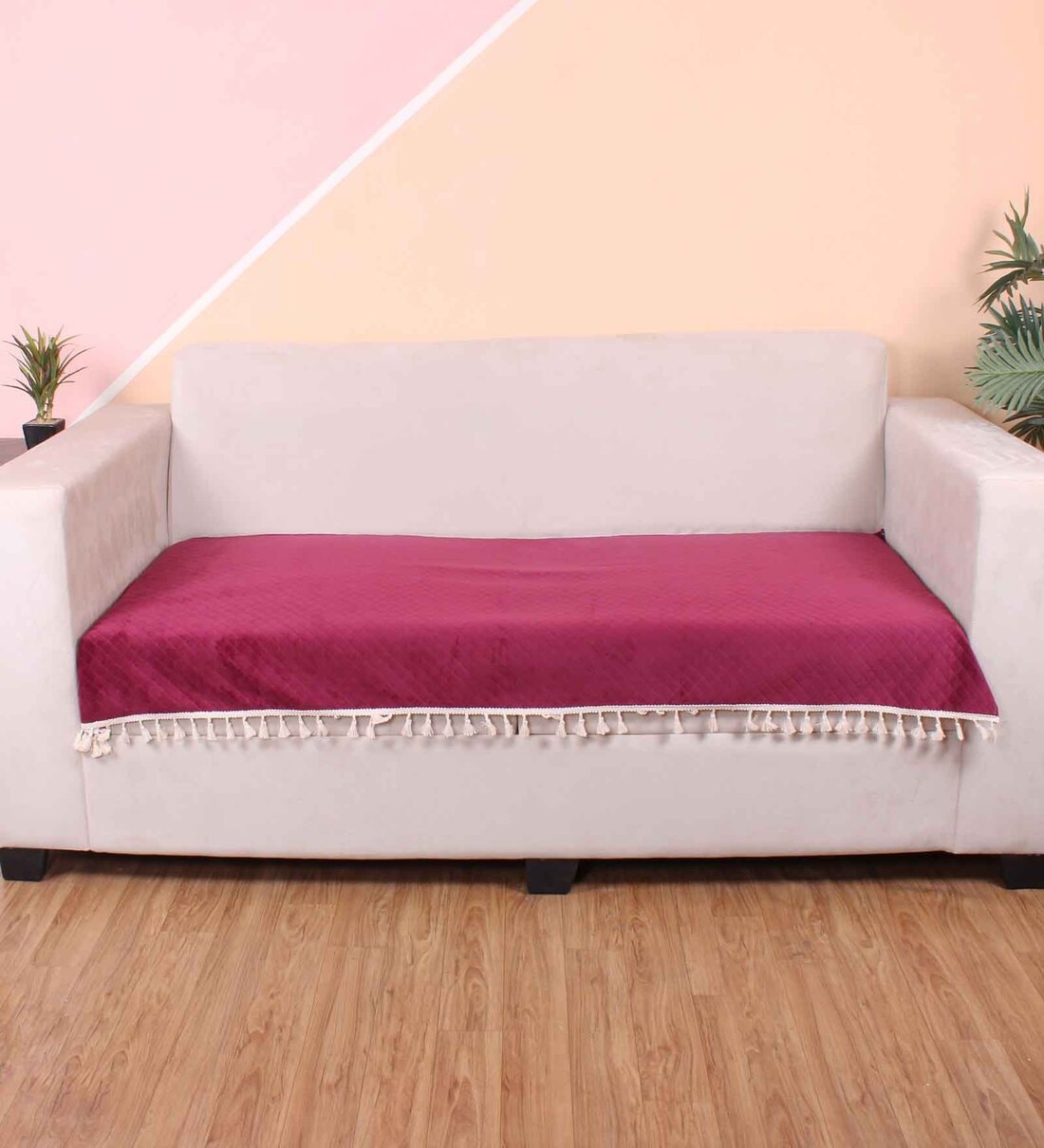 Maroon Solid Velvet 3 Seater Quilted Sofa Cover (Protector) with Tassel