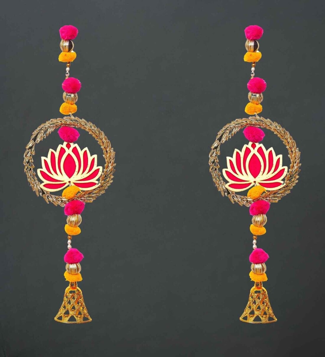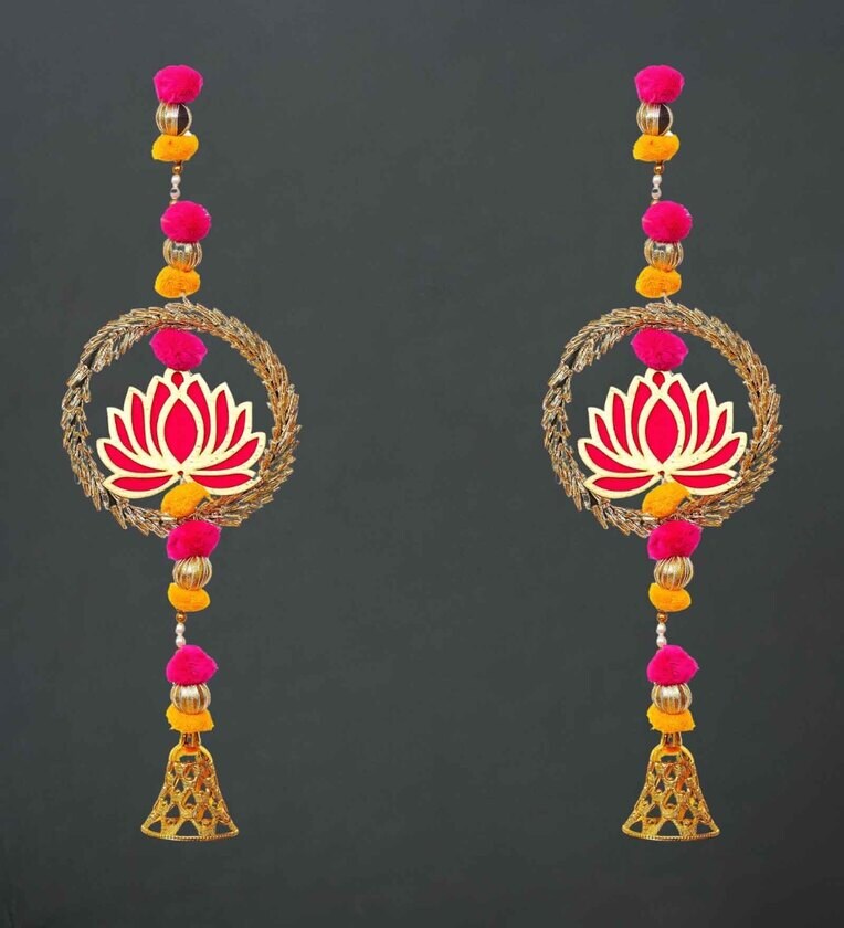 Pack of 2 Lotus in Golden Rings with Pom Pom, Bell Hangings Toran