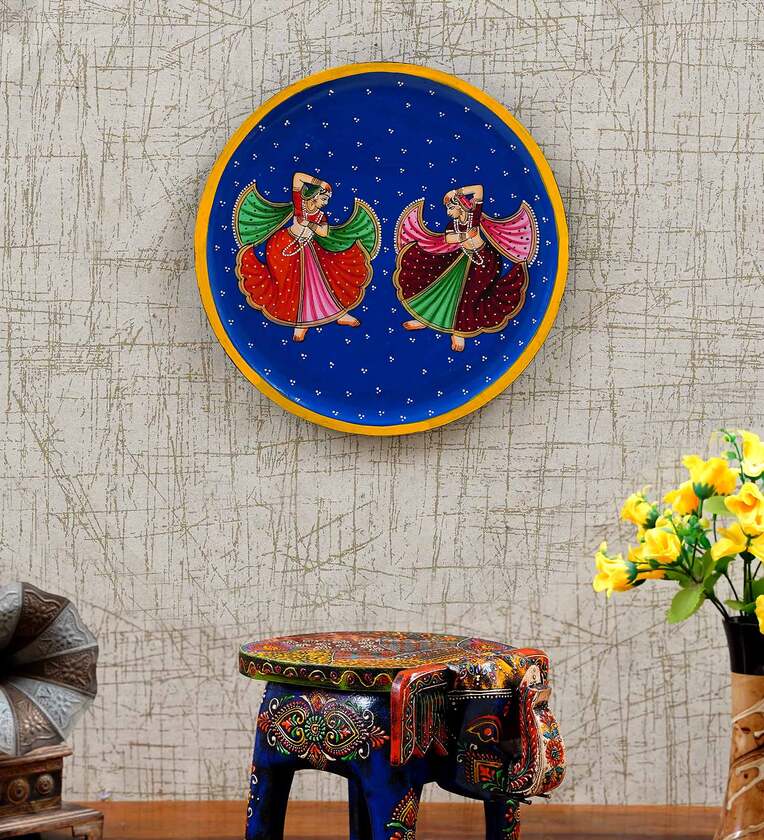Mdf Blue Colour Handpainted Dancing Lady Wall Hanging Round Plate