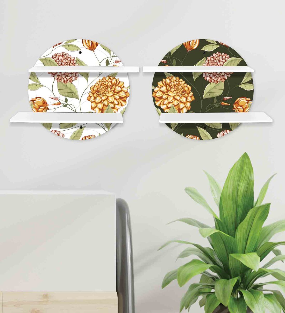 MDF Printed Contrast Floral Collection Circular Wall Shelf With White Plates